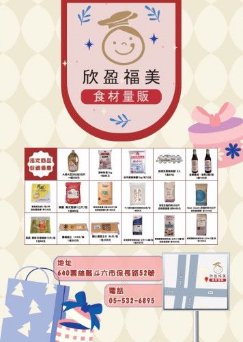 欣盈福美食材量販,位於雲林的在地食材與包裝材料供應專家,為烘焙業、早餐店、餐飲業者及個人消費者提供一站式購物體驗。我們嚴選各式優質烘焙材料、餐飲用食材,以及各類包裝、開店所需用品,滿足不同業態的需求。